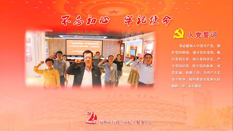 11月19日下午,组织部党支部到福州市民服务中心开展“党课开讲啦——学习贯彻党的十九届五中全会精神”主题党日活动。围绕深入学习贯彻党的十九届五中全会精神和习近平总书记系列重要讲话精神,通过实地参观、微党课等形式,进一步坚定理想信念,筑牢服务意识。